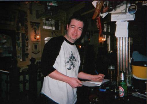Mark Mansell signs the guest book at the legendary Albion pub in the East End of London